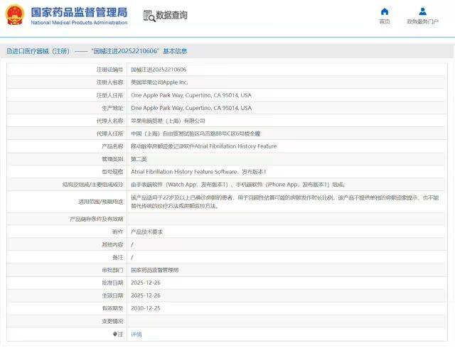 该功能的注册名称为移动脉率房颤迹象记录软件,于 2025 年 12 月 26 日正式获批。