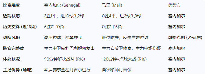 相比之下,**马里(老鹰)**虽然展现了极强的韧性(小组赛三连平,淘汰赛点球大战晋级),但球队正面临严重的战术瓶颈和人员危机。主力右后卫沃约·库利巴利(Woyo Coulibaly)的停赛以及中场大将纳·库利巴利(Lassana Coulibaly)的伤缺,将严重削弱其原本引以为傲的防守体系 。