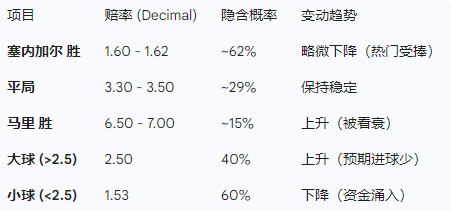 市场资金流向也印证了这一判断,大额资金主要流向塞内加尔胜平负(1X2)的主胜选项,以及“小球”(Under 2.5 Goals)市场,预示着这可能是一场攻防演练般的比赛,塞内加尔主控,马里死守 。