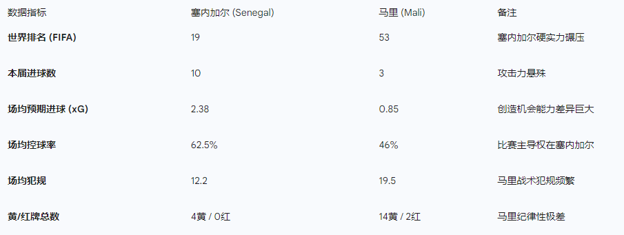 虽然马里的防守韧性值得尊敬,但足球比赛最终还是靠实力和进球说话。塞内加尔在进攻维度(xG、射门数)、阵容深度、体能储备(少踢30分钟)、主场优势以及历史心理层面占据全方位优势。