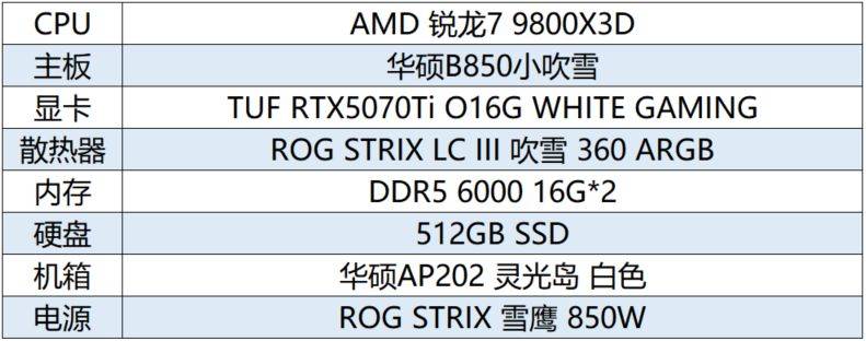 首先为大家推荐一套颜值与性能并存的MATX白色小钢炮主机,以华硕ROG B850小吹雪主板为核心,搭配AMD锐龙7 9800X3D处理器、华硕TUF RTX5070Ti O16G WHITE GAMING显卡等令人心动的电竞装备,可高画质流畅运行各类大作,整机灯效也能带给用户无与伦比的沉浸式游戏体验!